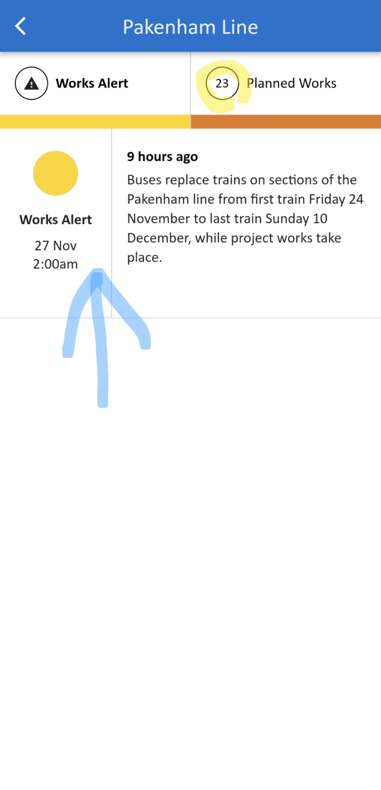 들어가면 아까 캘린더에서 봤던 것처럼 무수히 많은 알림을 하나하나 확인할 수 있습니다. 그렇지만 지금은 노선을 보기 위해 파란 화살표로 표시한 알림을 눌러 줍니다.