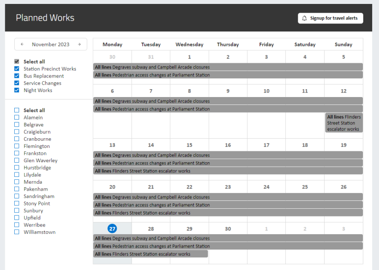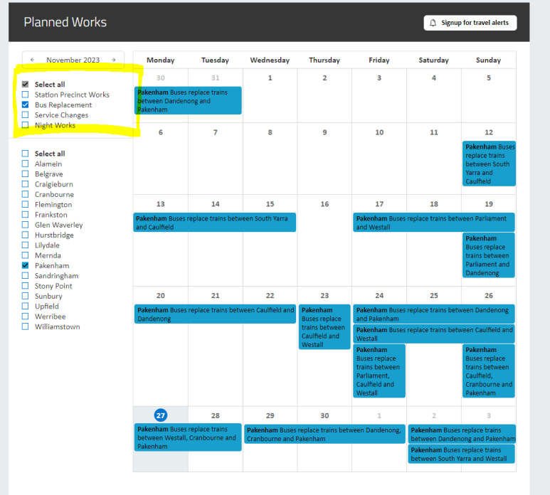 이제 여기서 지금 공사로 인해 replacement bus가 다니고 있는 Pakenham을 예시로 사용하겠습니다. 그럼 이렇게 무수히 많은 알림들이 뜨는데요, 대체 버스 노선만을 확인하고 싶은 것이니 왼쪽의 체크박스를 전부 해제해 대체 버스 노선만 남겨 두겠습니다.