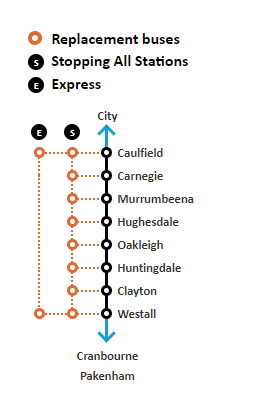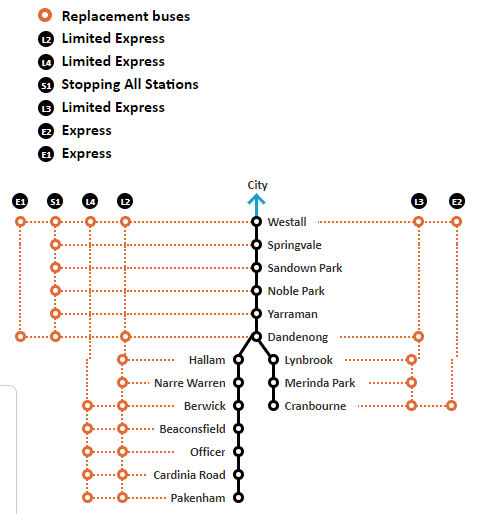 Express: E1, E2는 직행 노선입니다. 가장 많은 사람들이 타고 내리는 구역인 Dandenong부터 공사가 끝나는 역인 Westall까지 (E1), 노선의 끝인 Cranbourne부터 공사가 끝나는 Westall까지 (E2) 멈추지 않고 달리는 버스입니다.