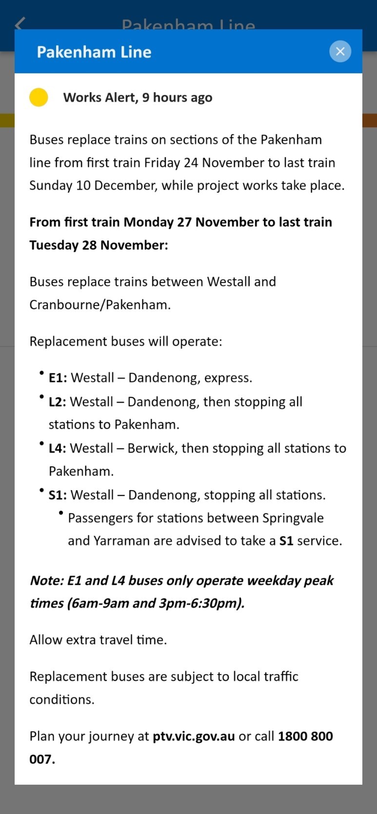 그럼 오늘(11월 27일)자 Pakenham 노선의 대체 버스 운행 스케줄을 한 번 확인해 보겠습니다.