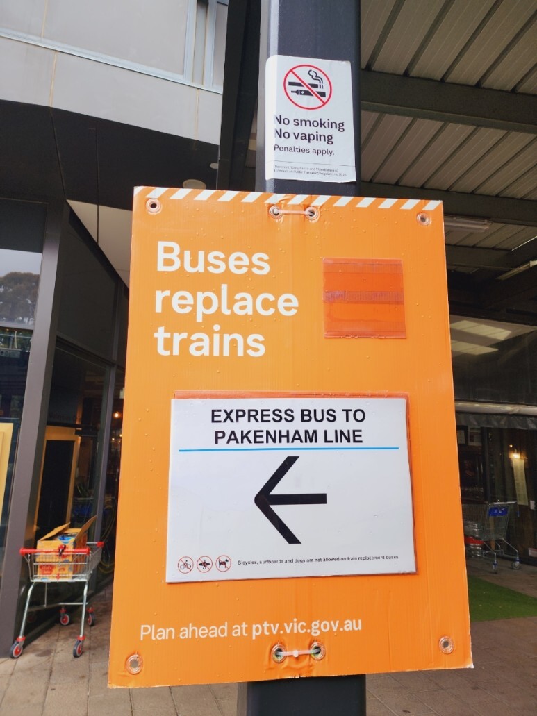 여담으로 사실 저는 Glen Waverley 역에 갔다가 이 표지판을 보고 Pakenham/Cranbourne의 운행 중단 사실을 알게 됐습니다.