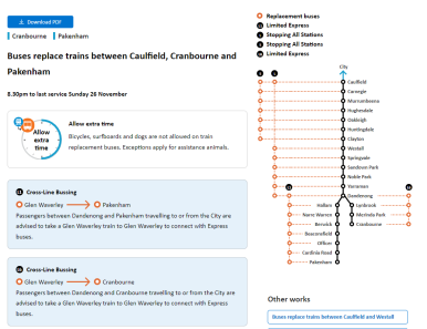 이제는 사진만 봐도 간단하게 이해 가능하실 것 같은데 왼쪽에 보면 Cross-Line Bussing이라는 새로운 노선이 있습니다. 노선의 가장 끝과 끝인 Pakenham과 Cranbourne에 사는 사람들을 위해 Pakenham/Cranbourne --> Glen Waverley 직행 대체 버스를 운행하는 것입니다. Pakenham 역에서 시티까지 버스로 이동하려면 자주 갈아타야 하고 한참 걸릴 것이기 때문에 다른 노선을 타고 이동할 수 있게 버스로 연결해 준 것이죠. 지도를 보면 조금 이해가 쉽습니다.