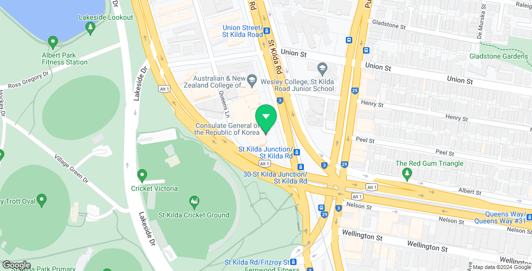 Tram번호 3, 3a, 5, 16, 64, 67 타고 St. Kilda Junction 역에서 하차