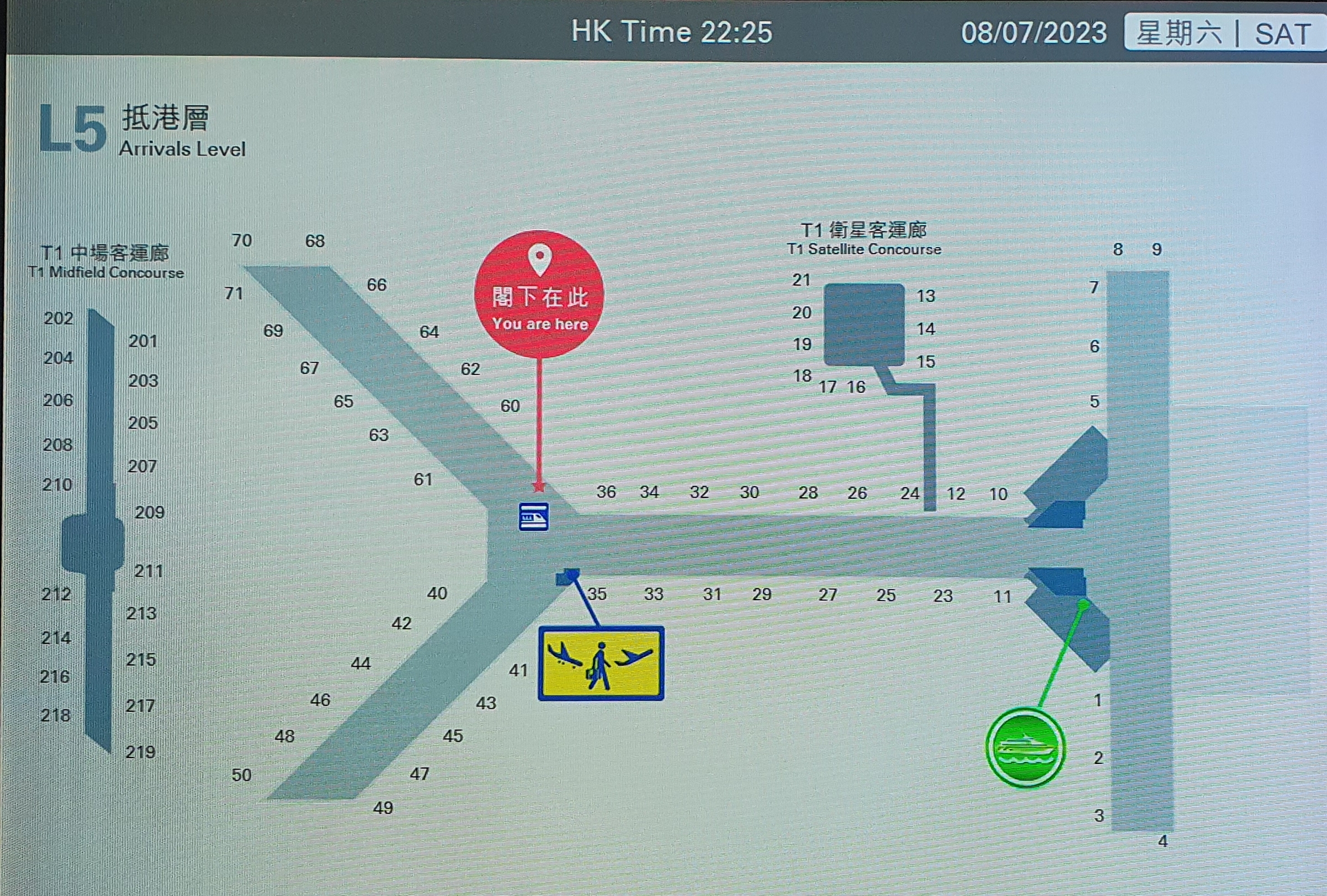 한국에서 출발하여 3시간 남짓 날아가니 홍콩에 도착하였어요. 캐세이퍼시픽 비행기는 아주 넓었고 개인 비디오가 있어서 영화두편 봤습니다. 이코노미가 비지니스석 같았네요. 우리 비행기는 1번 플랫폼에서 나를 내려주었어요. 이렇게 도착한 곳은 5층 ARRIVAL 대합실입니다. 게이트에서 바로 나오면 삼각형 모양의 대합실을 만나게 되는데요. 양쪽 귀퉁이에 transfer라는 표시가 있고 여기를 따라서 한 층을 더 올라가면 됩니다. 기내 수하물 xray 검사대를 통과해야 합니다.